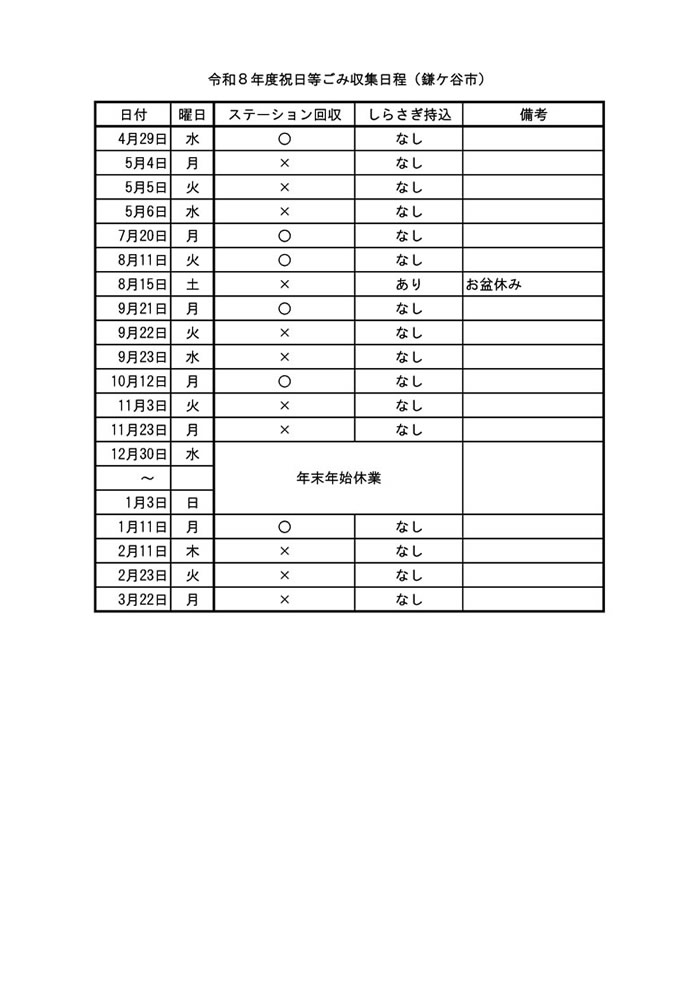 令和8年度祝日等ごみ収集日程について、下記表のとおりとなりますので、ごみを出す際には、お間違いのないよう午前8時までにお近くのごみステーションにお出しするようお願いいたします。