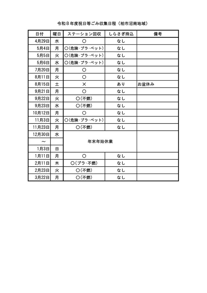 令和8年度祝日等ごみ収集日程について、下記表のとおりとなりますので、ごみを出す際には、お間違いのないよう午前8時までにお近くのごみステーションにお出しするようお願いいたします。